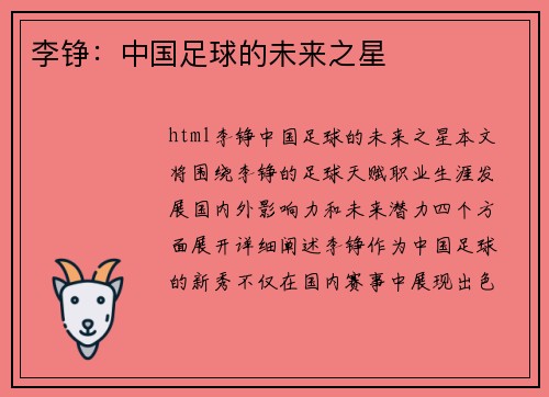 李铮:中国足球的未来之星,本文将围绕李铮的足球天赋、职业生涯发展、国内外影响力和未来潜力四个方面展开详细阐述。李铮作为中国足球的新秀,不仅在国内赛事中展现出色的技术和领导力,也在国际舞台上引起了广泛关注。他的成长与发展不仅代表了个人的进步,更象征了中国足球未来的希望与潜力。